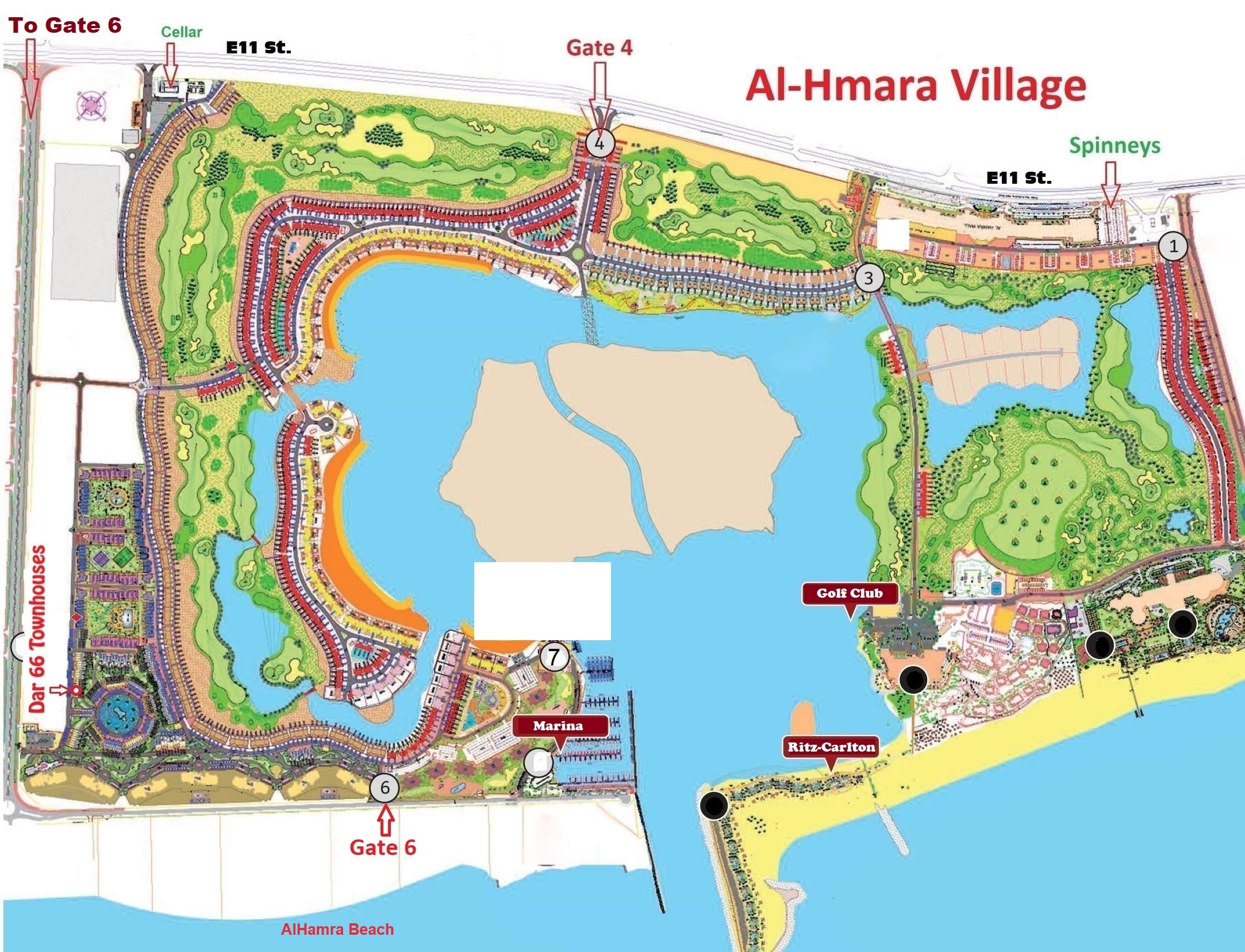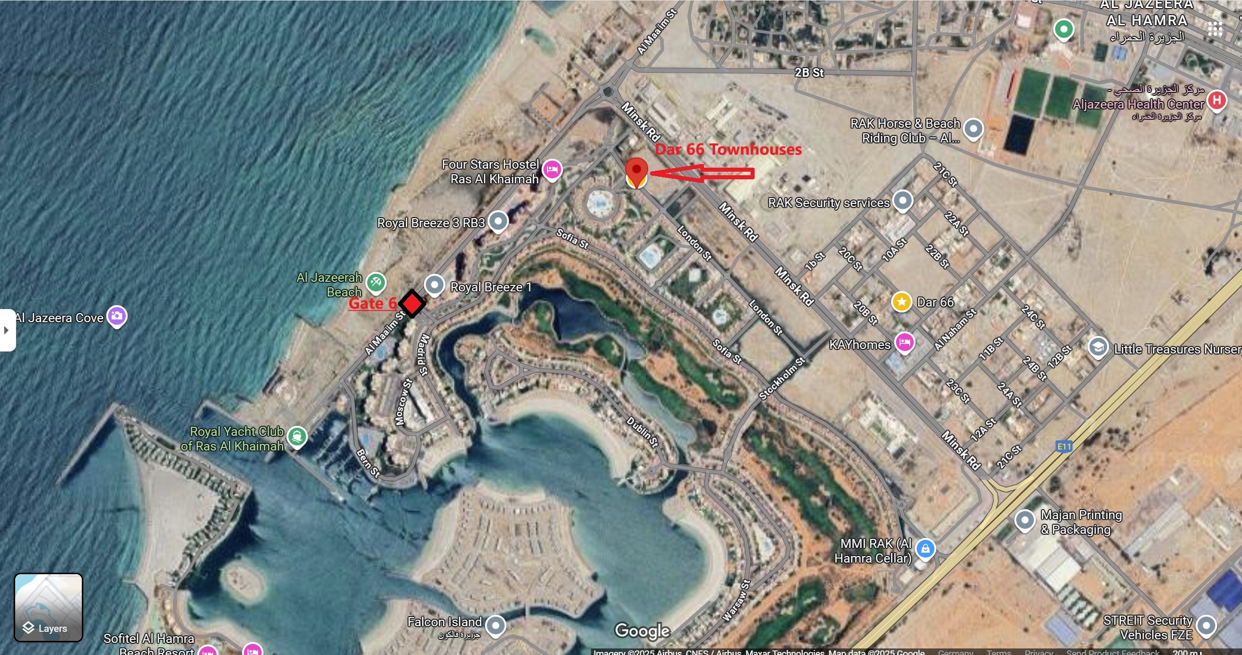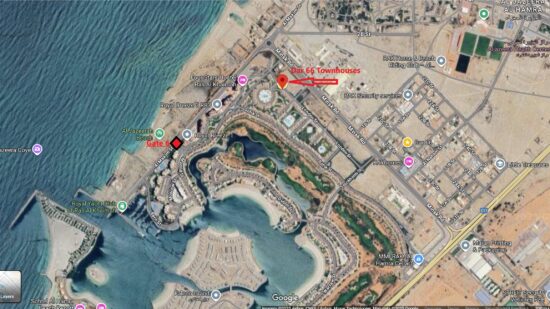 ● تقع بيوت دار 66 تاونهاوس داخل قرية الحمرا السكنية في رأس الخيمة، ولا تقع على البحر مباشرة، ولا ضمن فندق فهي مرخصة كبيوت عطلات، وتبعد حوالي 5 دقائق بالسيارة عن مجمع دار 66